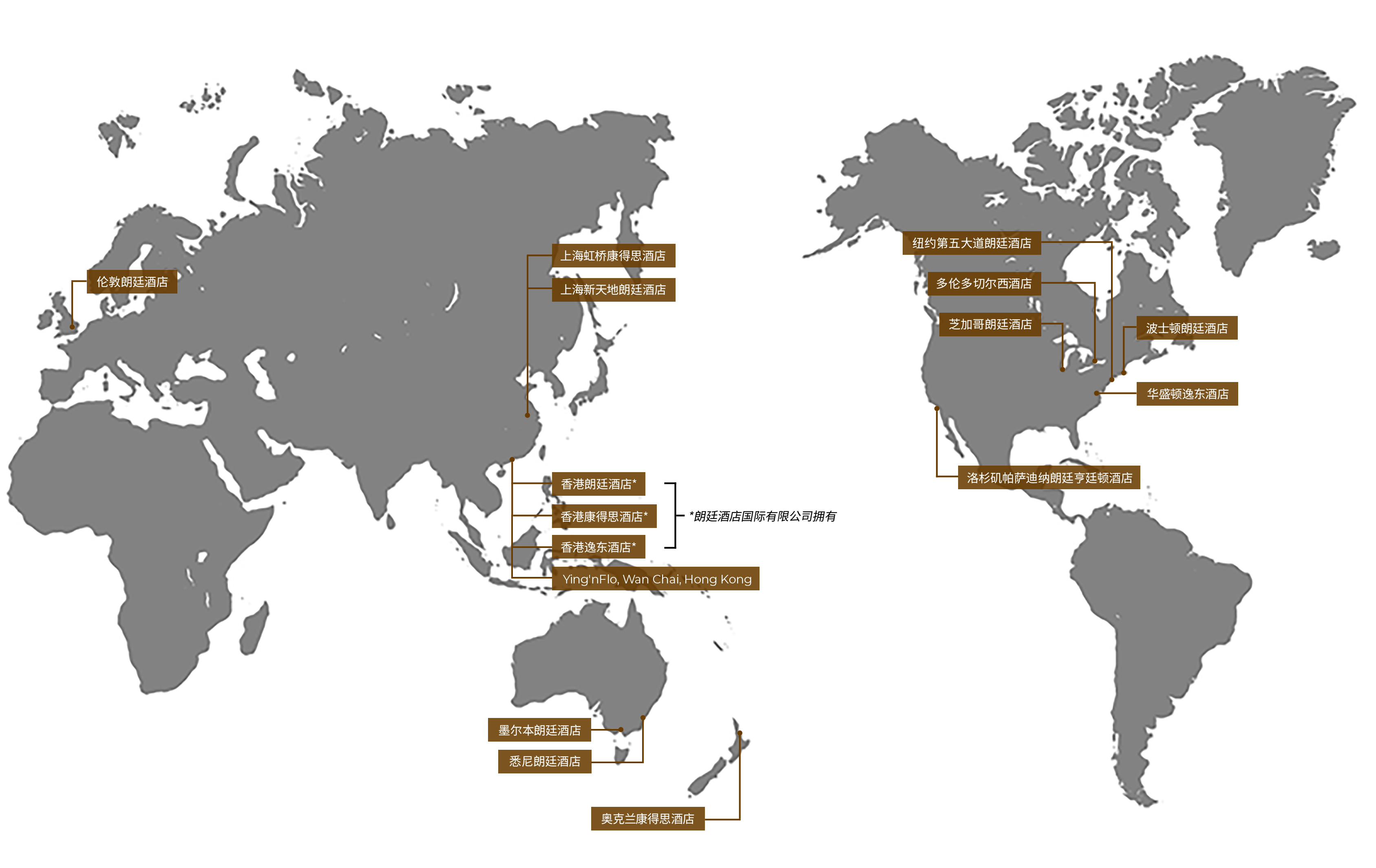 除了由鹰君集团拥有及部分拥有的酒店外,朗廷酒店集团亦为第三方管理的朗廷、康得思及其他联属品牌酒店。