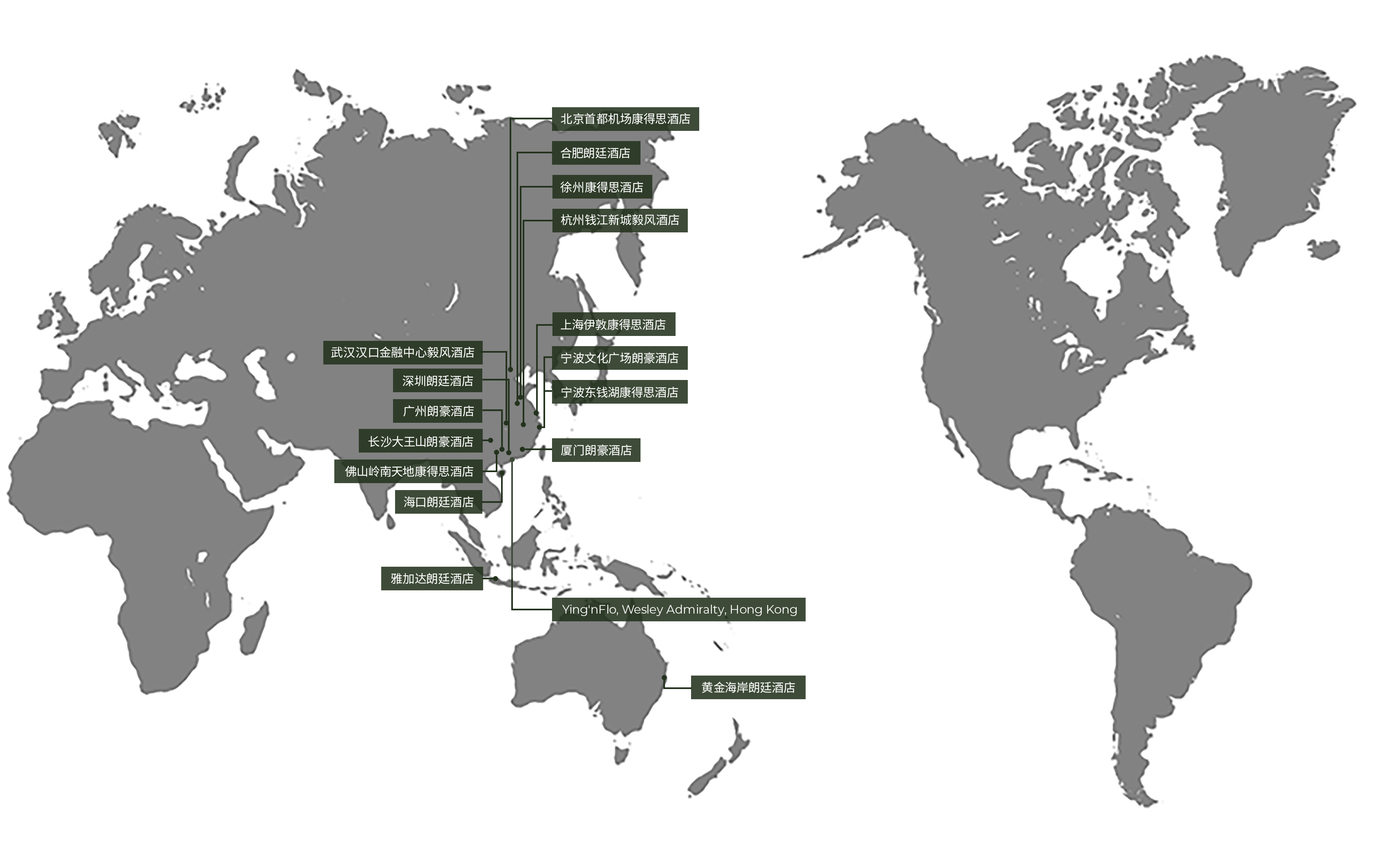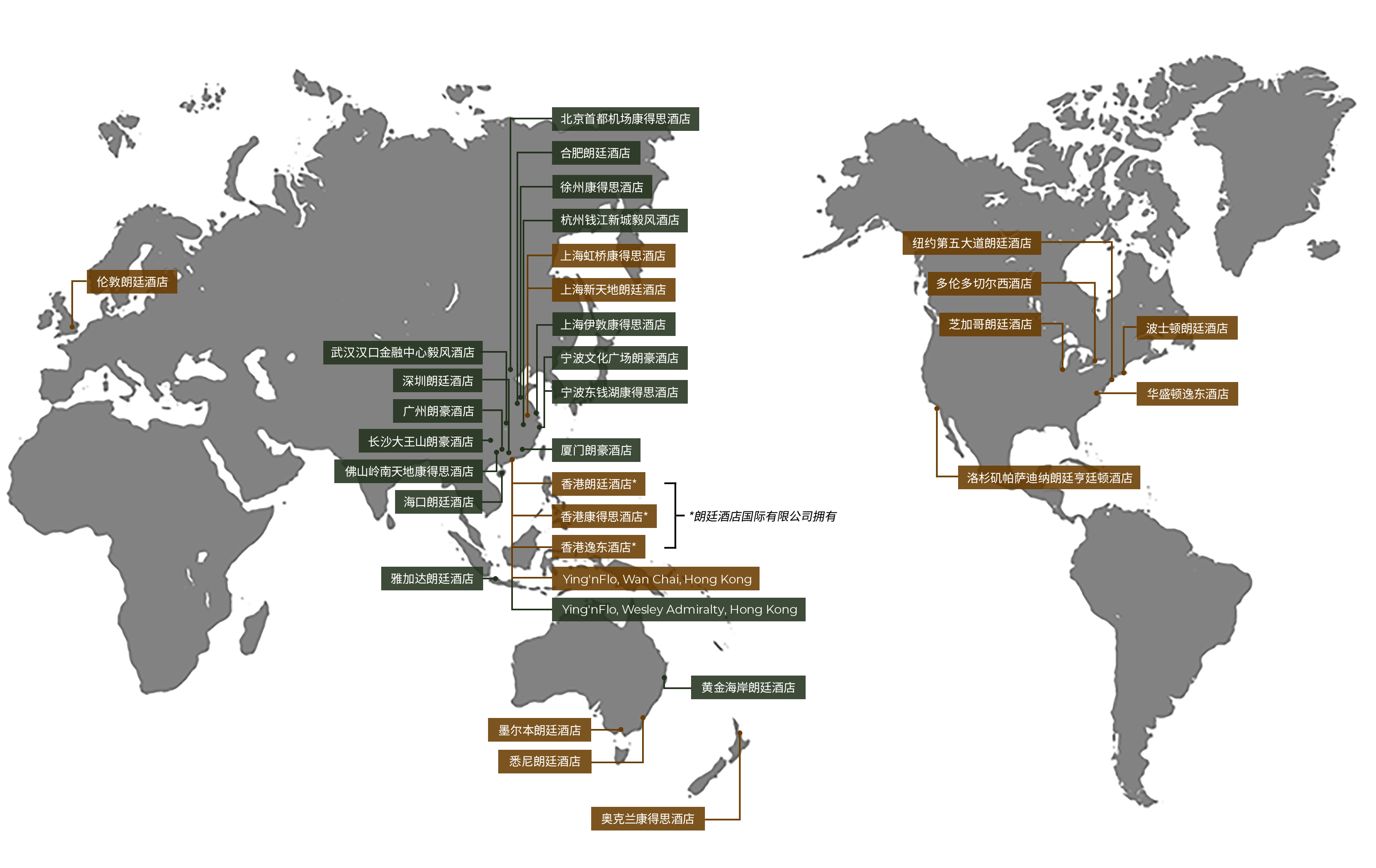 除了由鹰君集团拥有及部分拥有的酒店外,朗廷酒店集团亦为第三方管理的朗廷、康得思及其他联属品牌酒店。