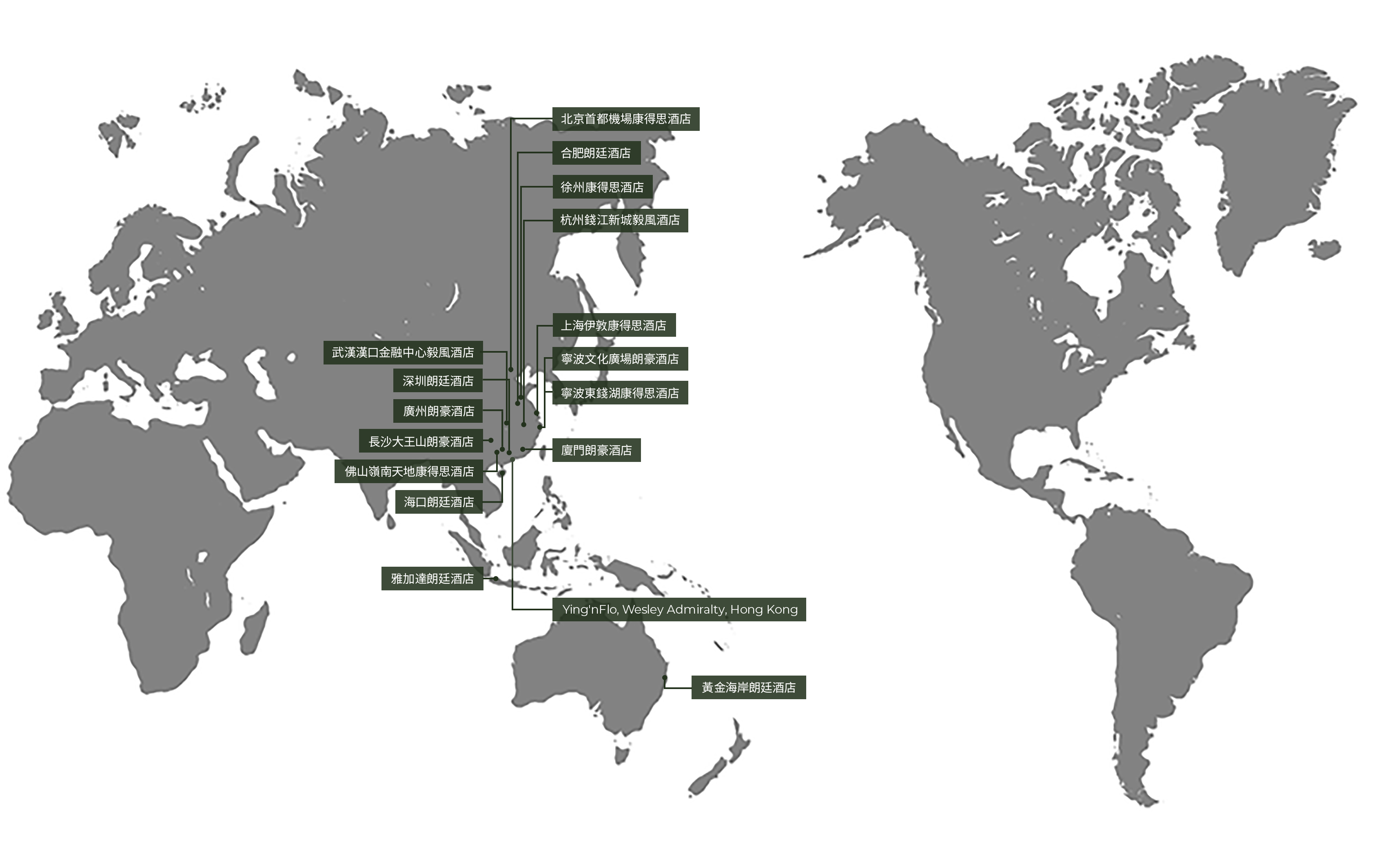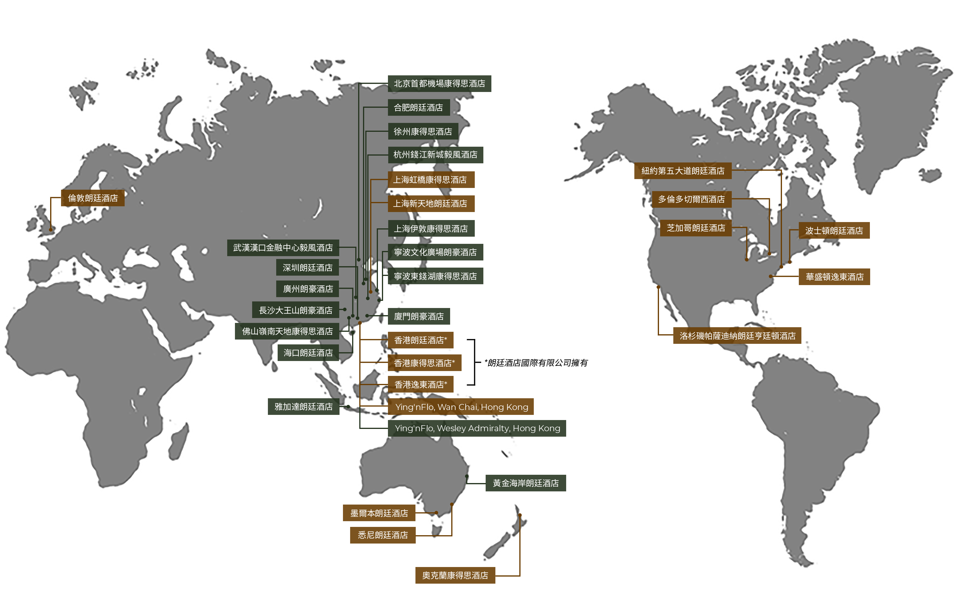 除了由鷹君集團擁有及部分擁有的酒店外,朗廷酒店集團亦為第三方管理的朗廷、康得思及其他聯屬品牌酒店。