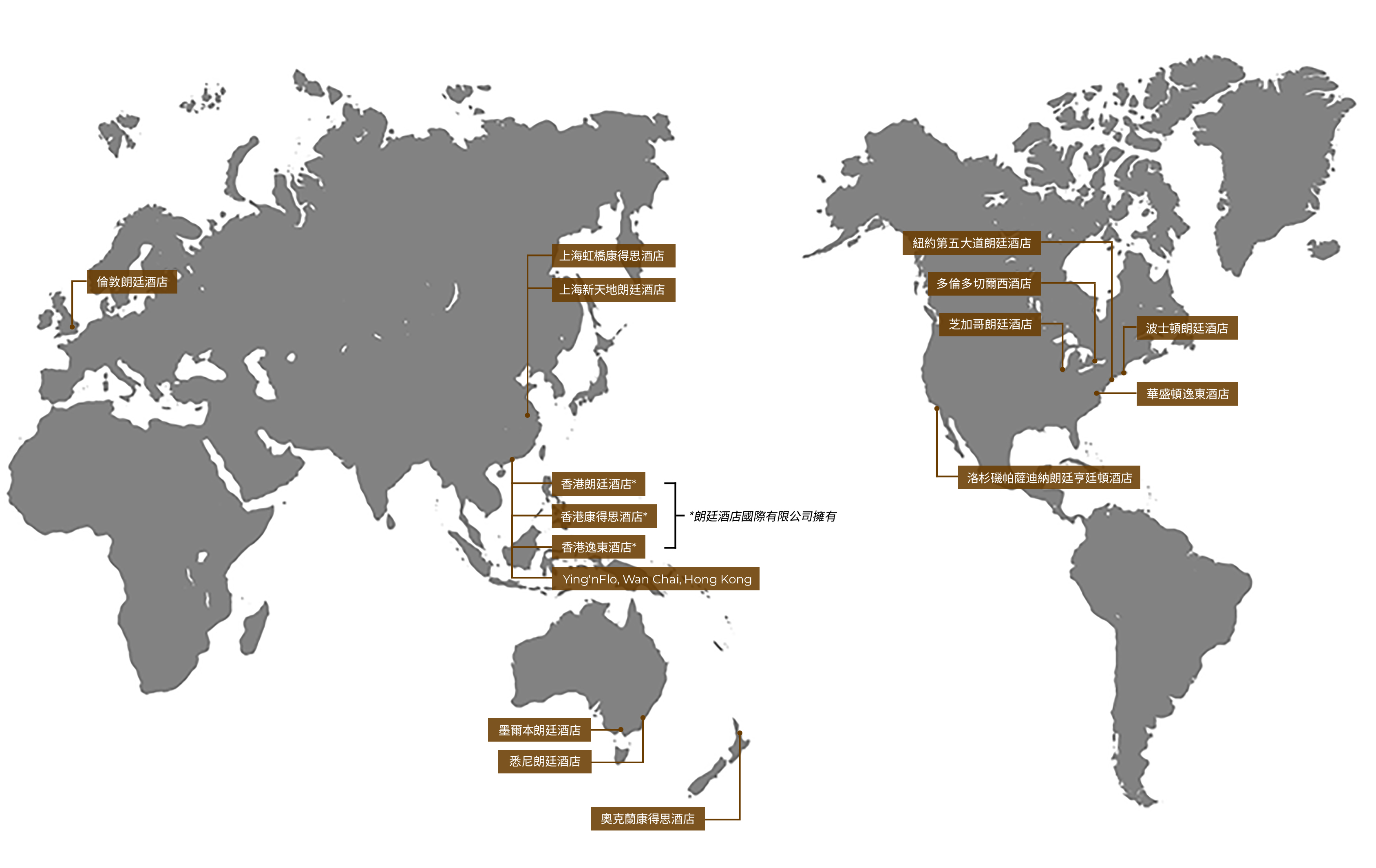 集團之酒店組合遍佈世界各地,目前擁有及管理逾30家豪華酒店,位於亞洲、北美洲、太平洋及歐洲。酒店以朗廷、康得思及其他聯屬品牌命名,享譽全球,更獲客戶視為尊貴優質的象徵。